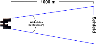Der Sehwinkel gibt an, wie groß der Ausschnitt des betrachteten Bildes ist. Ein großer Sehwinkel ermöglicht einen weiteren und entspannteren Bildeindruck, sorgt aber in erster Linie dafür, daß man das zu beobachtende Objekt einfacher findet und besser im Blickfeld behalten kann. Ferngläser mit großen Sehwinkeln sind sehr aufwendig zu fertigen und daher nie ganz billig. Ab einem Sehwinkel (hier ist es genauer gesagt der subjektive Sehwinkel) von 60° spricht man von Weitwinkligkeit.